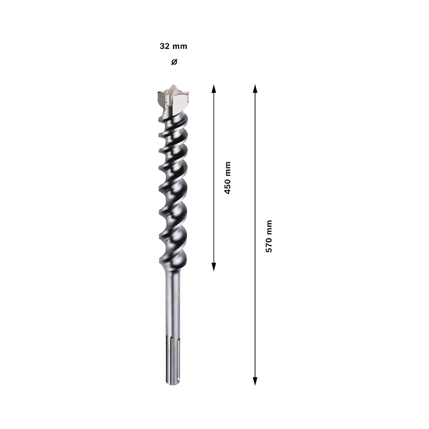 Diámetro de 32 mm, longitud de trabajo de 450 mm y longitud total de 570 mm, ideal para perforaciones de gran profundidad